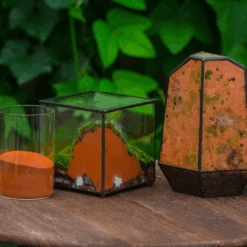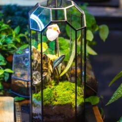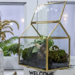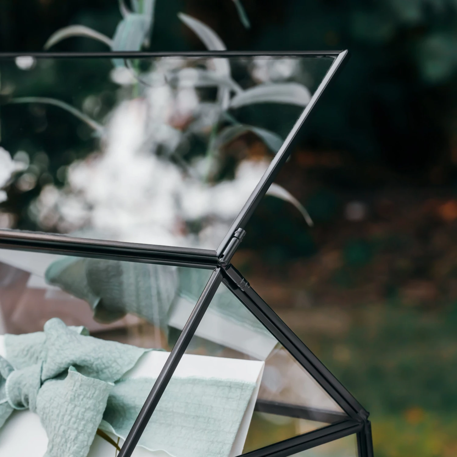 1. Handmade house-shaped glass geometric terrarium: this is the black version with an updated hinge. It can hold the lid in place properly; it is more sturdy. The lid will stay firmly with the box