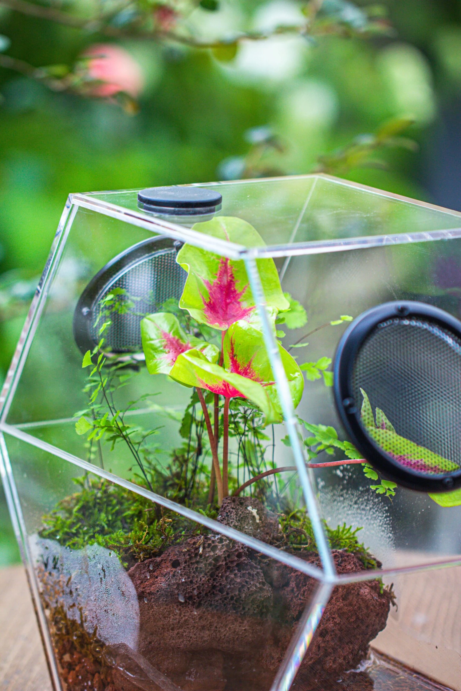 - This is a large terrarium, and you can put in your small tropical plants. In the photos, there are a caladium, two maiden hair fern. If you need some moss, please leave me a message and I am glad to send you some pieces.same as the photos show (Those mosss suits in such environment).