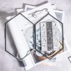 NCYP Vintage Black Brass Floating Hanging Glass Long Hexagon Photo Frame For Fern, Pressed Flower