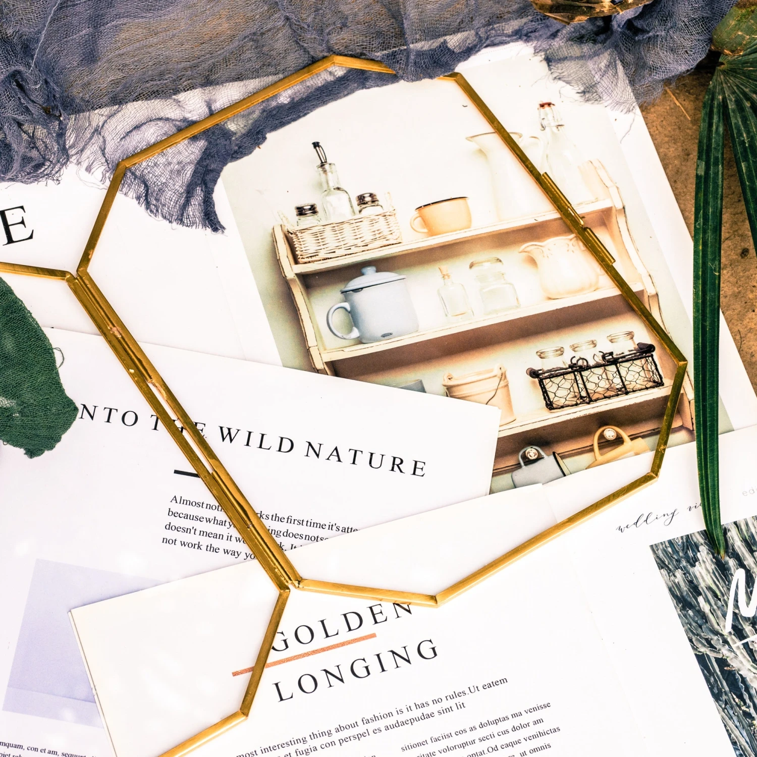 1. Handmade long octagon double glass brass and glass frame with a natural vintage gold color, go well with pressed flowers and plants